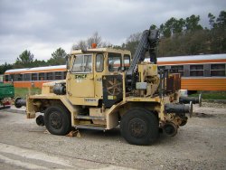 Cet engin rail-route de marque Brimont est équipé d’une grue hydraulique.